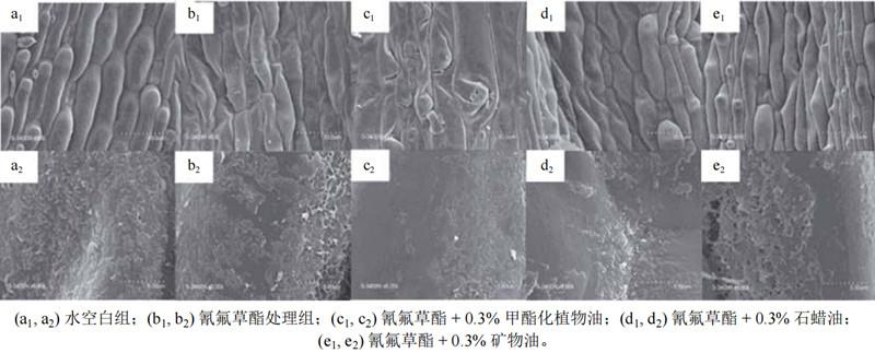 通過掃描電鏡觀察稗草葉片結構變化探究了油類助劑對氰氟草酯防除稗草的增效作用。作者分別對比了純水、氰氟草酯處理和添加油類助劑的氰氟草酯處理后的稗草葉片結構,發現水對稗草葉表面的蠟質層和表皮細胞沒有任何影響(圖1a1,a2),氰氟草酯使表皮細胞略有萎縮(圖1b1),溶解了少量的表皮蠟質層(圖1b2),而添加油類助劑后均發生表皮細胞變窄萎縮和蠟質層溶解的現象(圖1c1-e2)。其中,石蠟油和礦物油能使表皮細胞變窄變小,水分減少(圖1d1,e1),溶解大約30%的表皮蠟質(圖1d2,e2)。甲酯化植物油(MSO)能較大程度地使表皮細胞萎縮(圖1c1),溶解超過50%的蠟質層(圖1c2)。正是因為MSO(體積分數0.5%)溶解了大量稗草葉片的表皮蠟質層,嚴重破壞了葉片的角質層,從而極大地增強了稗草葉片對氰氟草酯的滲透和吸收能力,使其對氰氟草酯防除稗草的防效提高了78.7%。