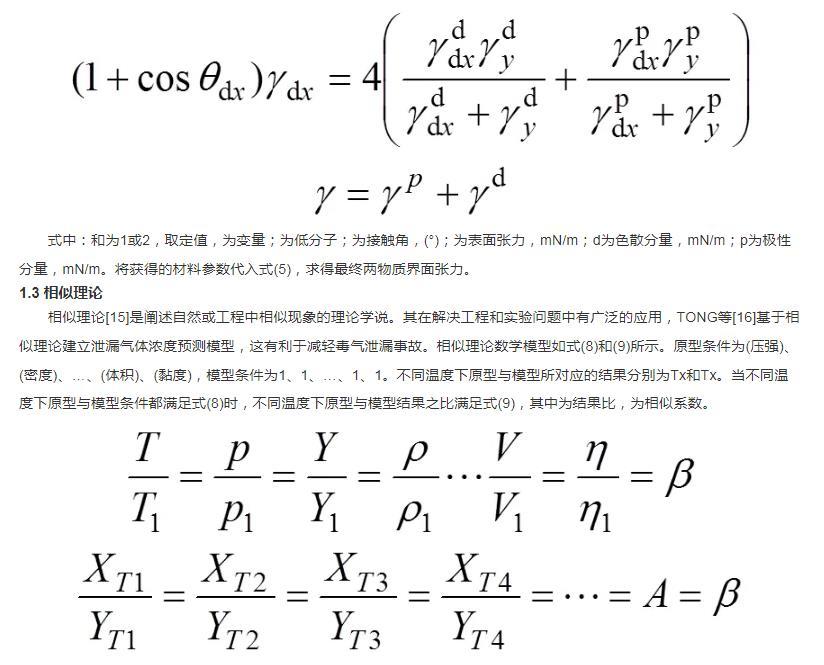 本文中原型與模型分別是指接觸角法與調和平均法,實驗材料及儀器相同,原型條件是測(測試溫度)、加(加熱時間)、靜(靜置時間)、(液滴體積)、(標準大氣壓);模型條件是測1(測試溫度)、加1(加熱時間)、靜1(靜置時間)、1(液滴體積)、1(標準大氣壓)。當相似系數為1時,采用調和平均法修正接觸角法。