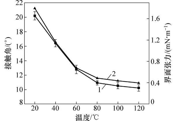 對20,40,60,80,100和120℃溫度下DBTL在CBT500光滑薄板上靜態接觸角進行測量,結果如圖4所示。結合上述溫度下DBTL界面張力1(如圖3所示),將和1代入式(3),計算相應溫度下DBTL與CBT500的接觸角法界面張力12,結果如圖4中界面張力所示。由圖4可知:隨著溫度升高,接觸角和接觸角法界面張力具有相同的下降規律,不同溫度區間內下降趨勢不同,20~60℃溫度區間下降趨勢最大,60~80℃溫度區間下降趨勢次之,80~120℃溫度區間下降趨勢平緩。由Young方程可得cos=(2?12)/1,代入上述關系,即溫度升高,接觸角減??;除此外,不同溫度區間內,DBTL對CBT500初期誘導率不同,從而導致不同溫度區間內靜態接觸角、界面張力下降趨勢不一致。