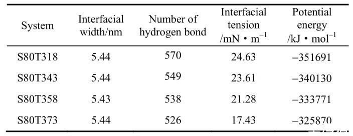 表2通過界面張力、表面活性劑與水的氫鍵數(shù)量、勢能3組數(shù)據(jù)對比得出表面活性劑的界面張力隨著溫度升高而降低的結(jié)論。數(shù)據(jù)表明在4組模擬實驗過程中,界面的寬度并沒有發(fā)生改變。因此界面張力下降的主要原因是由于OPES勢能的降低導致分子之間的作用力也隨之降低。