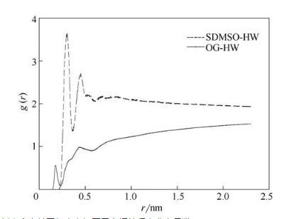 在OPES結(jié)構(gòu)中,有兩個親水基團分別為氧乙烯基(OG)、磺酸基(SDMSO),本文通過徑向分布函數(shù)(通常指的是給定某個粒子的坐標,其他粒子在空間的分布概率)來對比兩者與水之間的作用力。圖5為表面活性劑中氧乙烯基和磺酸基與水分子中氫原子的徑向分布函數(shù)、。由圖可知,(r)曲線第1個峰值出現(xiàn)在0.306處,這表明磺酸基中的氧原子與水g中的氫原子之間較強的氫鍵作用形成了第1水層;在距離為0.458時,出現(xiàn)第2個峰值,數(shù)值有所下降,這表示逐漸減小的氫鍵作用形成了第2水層;第3水層形成在0.688處,此時磺酸基與水的作用進一步減弱,但3處的峰值均遠大于氧乙烯基的峰值。這表明磺酸基與水分子的作用力遠高于氧乙烯基,所以磺酸基為辛基酚聚氧乙烯醚磺酸鹽結(jié)構(gòu)中的主要親水基團。