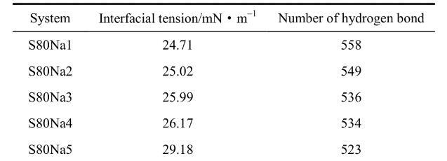 模擬數(shù)據(jù)顯示,隨著NaCl濃度的升高,表面活性劑在油水界面的界面張力僅有小幅升高,這是由于體系中不斷加入NaCl使得OPES更加親油,使得部分表面活性劑分子向油相中躍遷。另外,氫鍵數(shù)量有少量下降這是由于在體系不斷添加Na+、Cl-過程中,替換了水相中的水分子使得水分子數(shù)量減少從而影響了氫鍵數(shù)量。