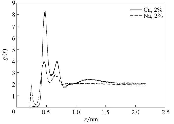 進一步分析OPES對Na+、Ca2+抗鹽性的差別,考察了磺酸基中的氧原子與Na+、Ca2+的徑向分布函數(shù),如圖11所示。圖中兩曲線的峰值出現(xiàn)較大差距,其中Na+曲線的峰值明顯小于Ca2+曲線的峰值,這表明親水基團與Na+的作用較小,也就是說Na+對OPES的性質(zhì)影響較小。因此,辛基酚聚氧乙烯醚磺酸鹽的抗鹽性順序為Na+>Ca2+,與對序參數(shù)所做的分析結(jié)論相同。
