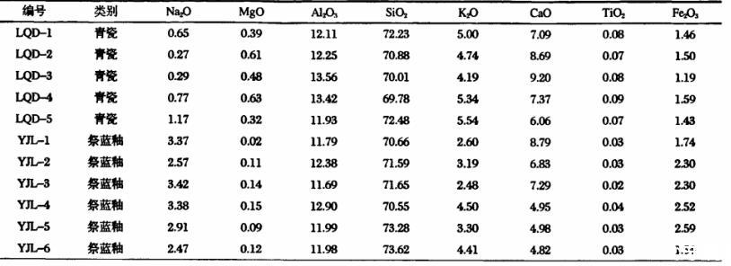 表2宋代龍泉青瓷釉和元代景德鎮(zhèn)元代祭藍釉的主、次量元素組成