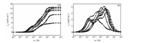 當(dāng)頻率較低時(shí),界面張力梯度在實(shí)驗(yàn)時(shí)間內(nèi)幾乎可以完全消除,由于界面形變所造成的能量變化幾乎完全耗散在環(huán)境中,對(duì)擴(kuò)張模量的貢獻(xiàn)可以忽略,εi接近于零;當(dāng)頻率較高時(shí),各種弛豫過程來不及發(fā)生,對(duì)擴(kuò)張模量的影響也可以忽略,εi仍然接近于零;只有在適宜的頻率范圍內(nèi),εi隨頻率變化而變化,并在其弛豫過程的特征頻率處出現(xiàn)極大值。