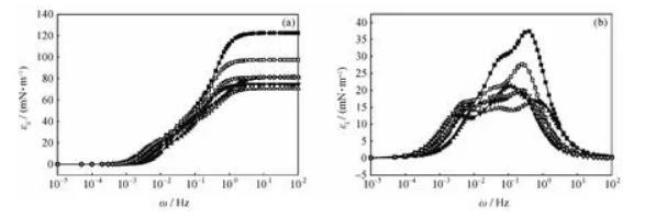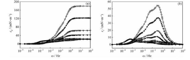 圖5含不同量酸性組分的煤油-1750mg/L HMPAM水溶液體系的界面擴(kuò)張彈性(εd)和擴(kuò)張黏性(εi)全頻率譜