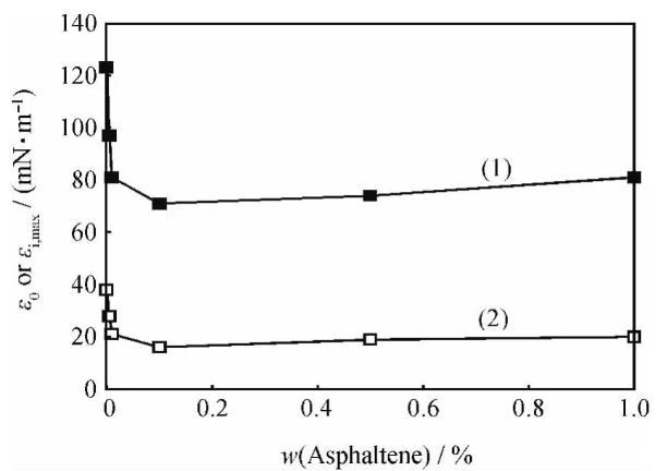 圖8含不同量瀝青質(zhì)的煤油-1750mg/L HMPAM水溶液體系的極限擴(kuò)張彈性(ε0)和擴(kuò)張黏性最大峰值(εi,max)