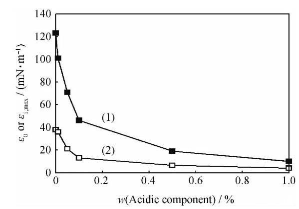 含不同量酸性組分的煤油-1750mg/L HMPAM溶液體系的界面擴(kuò)張彈性和擴(kuò)張黏性全頻率譜示于圖5,其極限擴(kuò)張彈性和擴(kuò)張黏性最大峰值示于圖6。從圖6可以看出,隨著酸性組分量的增加,ε0和εi,max逐漸減低,這與固定酸性組分濃度改變聚合物濃度得到的實(shí)驗(yàn)結(jié)果相一致。