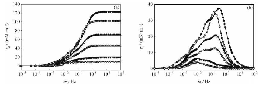 圖2不同濃度HMPAM水溶液-煤油體系界面擴(kuò)張彈性(εd)和擴(kuò)張黏性(εi)的全頻率譜
