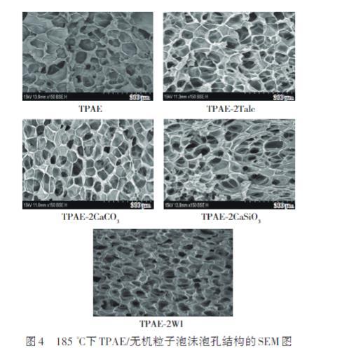 圖4 185℃下TPAE/無機(jī)粒子泡沫泡孔結(jié)構(gòu)的SEM圖