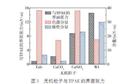為深入評估4種無機(jī)粒子與TPAE之間的相容性,本研究采用界面張力儀、接觸角儀計算了4種無機(jī)粒子與TPAE之間的界面張力,以定量分析其相容性。如圖3所示,可以看出,Talc與TPAE之間的界面張力為0.82 mN/m,表明二者相互作用力較強(qiáng),能夠更好地相互滲透和混合,反映出二者之間存在良好的相容性。