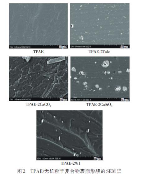 對比之下,含有CaSiO3、CaCO3、WI無機(jī)粒子的TPAE復(fù)合材料展示出典型的兩相形態(tài),這些粒子在TPAE基體中的均勻分散揭示了TPAE與這3種無機(jī)粒子之間在熱力學(xué)上的不相容性。值得注意的是,相比較于TPAE-2CaCO3和TPAE-2WI,TPAE-2CaSiO3復(fù)合材料的斷面形貌中的CaSiO3粒子表現(xiàn)出明顯的團(tuán)聚現(xiàn)象,這可歸因于CaSiO3獨(dú)特的多孔蜂窩狀結(jié)構(gòu),使得在含量增加時,粒子間相互碰撞并傾向于結(jié)合,容易形成更大的聚集體,使得CaSiO3粒子尺寸顯著大于其他兩種無機(jī)粒子。