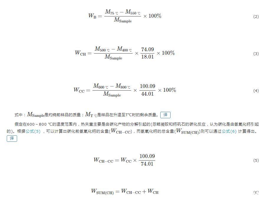 假定在600~800℃的溫度范圍內,熱失重主要是由碳化產物的分解引起的(忽略凝膠和鈣礬石的碳化反應,認為碳化是由氫氧化鈣引起的)。根據公式(5),可以計算出碳化前氫氧化鈣的含量,而氫氧化鈣的總含量則可以通過公式(6)計算得出。