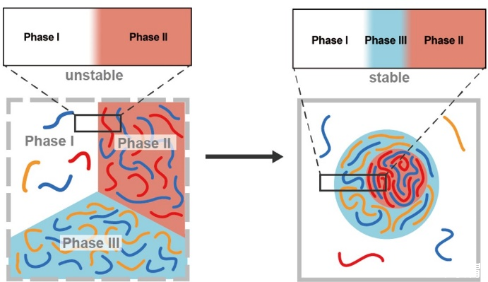 有別于簡單兩組分(聚陰離子與聚陽離子)體系,多組分聚電解質(zhì)體系會發(fā)生多相復(fù)合凝聚而出現(xiàn)共存的多個凝聚相,它們形成嵌套型或串珠型等各種多級分層結(jié)構(gòu),這些結(jié)構(gòu)的形成與生命體系中的分子定位、定向招募相關(guān),也是蛋白質(zhì)翻譯和核仁應(yīng)激反應(yīng)的結(jié)構(gòu)基礎(chǔ)。決定凝聚物體系采取何種多級液滴結(jié)構(gòu)的關(guān)鍵因素正是不同共存相間的界面張力。因此,深入研究多相凝聚體系的界面張力具有非常重要的價值。當(dāng)前理論僅處理簡單兩組分體系形成的稀相與濃相間的界面,多相分離體系的界面張力尚未得到解決。