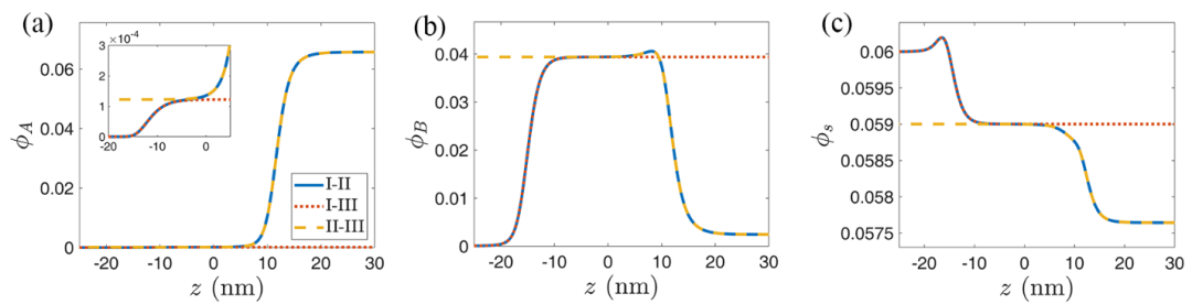 圖2.I-II相界面處的物種濃度分布曲線與I-III相界面和II-III相界面的濃度分布曲線對比。藍(lán)色實線為I-II相界面的濃度分布曲線,左側(cè)為I相,右側(cè)為II相;紅色點線I-III相界面的濃度分布曲線,左側(cè)為I相,右側(cè)為III相;黃色虛線為II-III相界面的濃度分布曲線,左側(cè)為III相,右側(cè)為II相。
