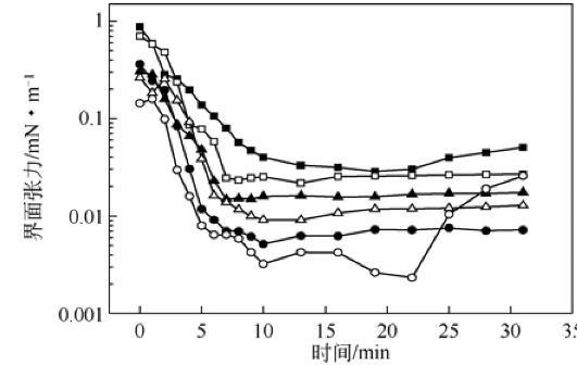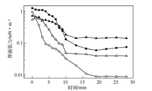 圖7不同助劑對復(fù)配體系油/水動態(tài)界面張力的影響