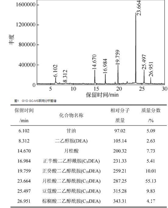 取一定量的GYD,用甲醇作溶劑,將其稀釋至約0.4%的質(zhì)量分數(shù)后,進行GC-MS全掃描分析,得總離子流色譜圖見圖1。用氣相色譜數(shù)據(jù)處理系統(tǒng),以峰面積歸一法測得其中各組分的相對質(zhì)量分數(shù),分析結(jié)果見表2。從表2可以看出,GYD是一種組成復(fù)雜的烷基醇酰胺混合物,主要包括不同碳數(shù)脂肪酸二乙醇酰胺和剩余原料甘油、二乙醇胺、月桂酸等。其中,月桂酸二乙醇酰胺相對含量最高為55.13%。