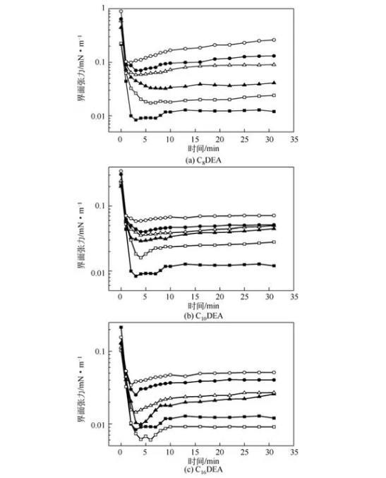 圖4 C8 DEA、C10 DEA、C16 DEA對C12 DEA/C14 DEA復(fù)配體系油/水動態(tài)界面張力的影響