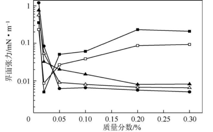 圖2不同烷醇酰胺油/水界面張力穩(wěn)定值隨質(zhì)量分數(shù)的變化曲線