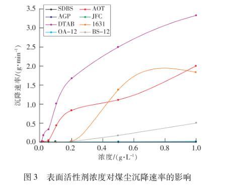 從表4和圖3可以看到,在0.000 1~1 g/L的濃度范圍內,煤塵的沉降時間隨表面活性劑濃度的增大而減小,沉降速率則隨濃度的增大而增大。當濃度小于0.005 g/L時,煤塵在8種表面活性劑溶液中的沉降時間均大于1 h,沉降速率接近于0,在溶液表面會形成一層黑色的“膜”,煤塵無法沉降。隨著表面活性劑溶液濃度增大,煤塵的沉降時間將會縮短,速率會增大,當濃度超過臨界膠束濃度后,溶液表面張力隨濃度增加不再改變,但沉降時間會繼續(xù)縮短,沉降速率會繼續(xù)增大,這可能是由于煙煤的煤塵具有較大的比表面積和孔隙率,表面活性劑濃度的增大,更多的表面活性劑分子有機會吸附于煤塵上,加快了煤塵沉降。陰離子和非離子表面活性劑的溶液濃度對潤濕煤塵作用的影響較大,當表面活性劑濃度從0.1 g/L增大到0.2 g/L時,煤塵在SDBS和JFC中的沉降時間分別從58.17 min和22.75 min迅速降至7.3 min和4.73 min;當表面活性劑濃度從0.005 g/L增大到0.05 g/L時,煤塵在AOT和APG的沉降速率分別從0002 2 g/min和0.002 5 g/min迅速增至005 g/min和0.33 g/min。而在0.000 1~1.0 g/L的實驗濃度區(qū)間內,濃度對陽離子和兩性型表面活性劑潤濕煤塵作用的影響都較小,潤濕煤塵效果較差。SDBS,AOT,APG和JFC4種表面活性劑濃度分別達到0.5,0.1,0.02和0.5 g/L時,煤塵在溶液中的沉降時間小于1 min,速率大于1.0 g/min,煤塵效果好。