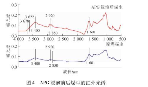 由上述實驗結果可以看到,在8種表面活性劑中,非離子表面活性劑APG形成膠束和降低表面張力的能力最強,潤濕煤塵效果最好。通過測定APG浸泡前后煤塵表面官能團及粒徑分布特征的變化,分析其潤濕煤塵的作用機理。