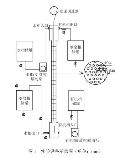 水相和有機相分別通過可調節流速的蠕動泵進入塔內,兩相在塔內實現逆流接觸傳質后分別從塔底和塔頂的出口流出進入各自儲罐。實驗中溶質丁二酸從有機相向水相傳遞,有機相和水相分別作分散相,以此來考察溶質從分散相到連續相(d→c)和從連續相到分散相(c→d)不同傳質方向對萃取效果的影響。