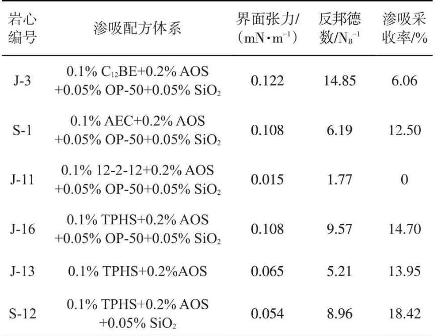 為驗證TPHS活性納米流體在滲吸采收率的應用,采用靜態滲吸實驗開展TPHS及常見表面活性劑復配溶液滲吸效果對比研究,巖心的基本物性參數見表2,不同體系與原油間的界面張力、所計算的反邦德數和滲吸采收率結果見表3,結果表明在滲吸過程中毛管力起主導作用。