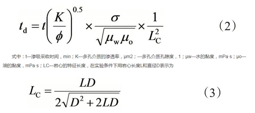 式中:t—滲吸采收時間,min;K—多孔介質的滲透率,μm2;—多孔介質孔隙度,1;μw—水的黏度,mPa·s;μo—油的黏度,mPa·s;LC—巖心的特征長度,在實驗條件下用巖心長度L和直徑D表示為