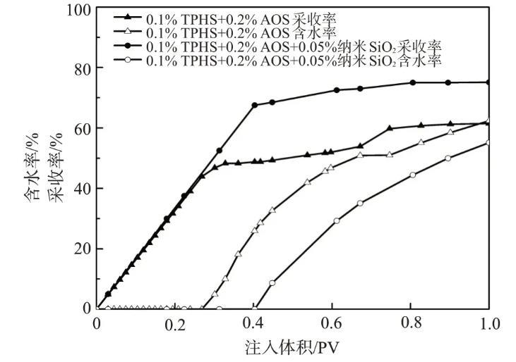 少量納米SiO2顆粒與TPHS、AOS復配即可產生潤濕協同作用,提高滲吸速率和采收率,并能形成乳液穩定油墻,延長無水采油期。