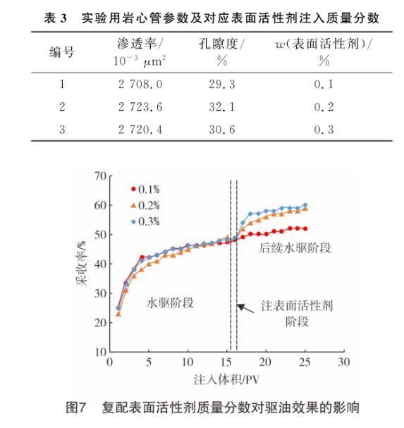 圖7為復配表面活性劑在模擬油藏條件下的巖心管(巖心管具體參數及對應表面活性劑的注入質量分數見表3)驅油實驗效果。由圖7可知,注入不同質量分數的復配表面活性劑后,后續水驅階段原油采收率均比前期水驅階段有所提高。當表面活性劑質量分數分別為0.1%、0.2%和0.3%時,采收率分別提高了5.8%、9.4%和10.3%。通過對比質量分數大小與采收率增幅發現:當表面活性劑質量分數由0.1%增至0.2%時,采收率增加了3.6%;當表面活性劑質量分數由0.2%增至0.3%時,采收率僅增加了0.9%。因此,從成本角度考慮,建議將表面活性劑的使用質量分數控制在0.2%~0.3%。