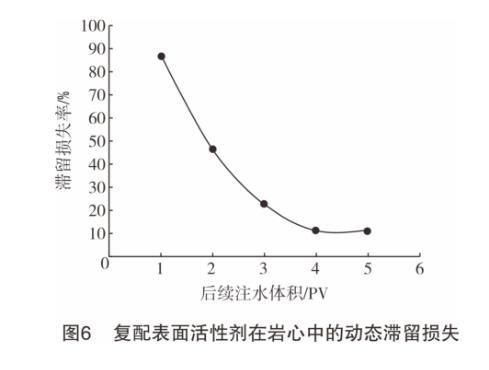 表面活性劑在驅油過程中,不可避免地會與油藏巖石壁面發生吸附,造成滯留損失。測定表面活性劑在油藏巖石壁面的滯留損失量,對現場施工設計和表面活性劑的優化均具有重要的指導意義。圖6為復配表面活性劑在模擬油藏平均滲透率為2 720.3×10-3μm2巖心管中的動態滯留損失測定結果。