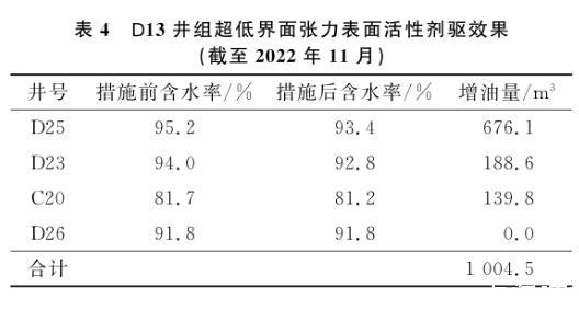 油藏評估結果顯示,D13井所控區域剩余可采儲量約6.7×104m3,剩余可采儲量較大。為挖掘該井所控區域油藏潛力,2022年4月開始對該井進行超低界面張力表面活性劑驅油先導性試驗,2022年10月結束,共計注入表面活性劑溶液3 600 m3。考慮到滯留損失,試驗將表面活性劑質量分數設計為0.3%。在注入過程中,注入壓力由8.9 MPa逐漸上升至10.2 MPa,分析認為表面活性劑在地層中將剩余油乳化,乳化形成的油滴產生疊加的賈敏效應所致。從表3的試驗結果可知,截至2022年11月,施工結束1個月后,D13井對應4口生產井中,除D26井因注采井距相對較遠,尚未見效外,其余3口井均已開始逐漸見效。見效井含水率下降0.5%~1.8%,1個月內已實現在水驅基礎上增油1 004.5 m3,這說明超低界面張力表面活性劑能實現剩余油的有效啟動。