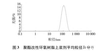 制備的聚酯改性環(huán)氧樹脂上漿劑乳液性能見表3,粒徑及分布測(cè)試結(jié)果見圖3。