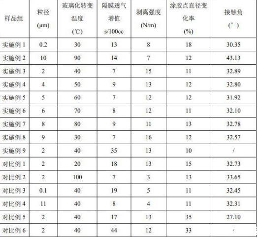 測試結果表明,當膠液稀釋液表面張力在28mN/m以上時,隔膜粘接劑組合物涂布并干燥后的膠點直徑變化率較小,當表面張力太低時,膠點直徑變化率較大,透氣增值變大。當聚合物顆粒A粒徑在0.2-10μm,玻璃化轉變溫度在30-90℃范圍內時,隔膜同時具有較低的透氣增值以及更好的剝離強度。聚合物顆粒A粒徑太小時,容易堵塞隔膜孔道造成透氣增值增大,并且剝離強度也較弱。聚合物顆粒A粒徑太大,聚合物顆粒A涂布后容易脫落,剝離強度降低。聚合物顆粒A玻璃化溫度太高,熱壓時無法軟化,剝離強度低;而玻璃化溫度太低則容易成膜,造成隔膜透氣增值變大。