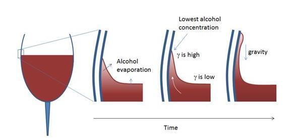 因此,這會在彎月面和葡萄酒與空氣間的平坦接觸表面之間形成濃度差,隨后將造成表面張力梯度(表面張力上大,下小),隨著時間推移,使彎月面沿著玻璃杯壁向上移動。