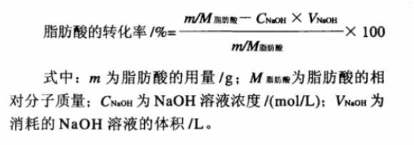 脂肪酸轉(zhuǎn)化率的測定:以酚酞為指示劑,用0.05mol/L NaOH溶液滴定反應(yīng)液中未反應(yīng)完的脂肪酸量。計算脂肪酸的反應(yīng)轉(zhuǎn)化率。