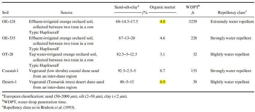 來自以色列不同地區(qū)的五種防水土壤 過篩(1 毫米)并在室溫下儲(chǔ)存在玻璃容器中 實(shí)驗(yàn)室條件(平均溫度 ? 24.5°C,平均 相對濕度 (RH) ? 65%)。 兩種土壤 (OE-128 和 OE-335; 典型的單氟草胺)是從相同的 污水灌溉的商業(yè)柑橘園與以前一樣 研究(Wallach 等人,2005 年;Graber 等人,2006 年)位于 以色列沿海平原的中部(31°59¢30.562)。 一 土壤(OT-28;典型單頭草)是從水龍頭中獲得的 同一商業(yè)果園的水灌溉柑橘地塊。 一種 沙丘沙是從附近的沙丘間地區(qū)獲得的 位于地中海的尼察尼姆自然保護(hù)區(qū) (31°16¢37.242) 海(Coastal-1)和來自沙間地區(qū)的粘土砂 內(nèi)蓋夫北部沙漠 (30°52¢02.592; (Desert-1) 的 Halutza 附近。表 1 列出了顯著的土壤特征。