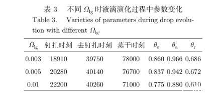 液滴鋪展、釘扎和去釘扎三個階段的重要時間參數及角度參數如表3所列.與增加接觸角遲滯影響不同的是,Ωlg增加后,液滴的θe,θa和θr均減小,強化液滴在壁面上的潤濕效果,液滴傳熱也得以加強,液滴蒸發加快.接觸線開始釘扎和去釘扎時刻延后,這是由于達到較小的θa和θr需要一定時間.在3.1節中,增加Δθ時,θa增大,θr減小,液滴蒸發同樣加快,因此通過增加接觸角遲滯,亦或提高氣-液界面張力對溫度的敏感性,均可以減小后退接觸角,從而實現液滴的快速蒸干.這一結論與Kulinich和Farzaneh所提出的固著水滴的蒸發行為受潤濕滯后(或后退接觸角)控制是相符的.