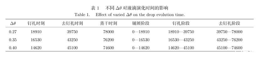 由表1可知,Δθ=0.27下液滴開始釘扎和去釘扎的時刻分別為t=18910和t=39750,Δθ=0.35下開始釘扎和去釘扎的時刻為t=16530和t=43250,而Δθ=0.40下則為t=14620和t=45100,即接觸線釘扎開始時刻提前,去釘扎時刻延后.由此可知,增大遲滯角,延長了接觸線釘扎時間,縮短了鋪展階段和去釘扎階段時長,同時加快了液滴蒸干歷程.