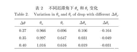 接觸線開始釘扎和去釘扎時液滴分別達到前進接觸角和后退接觸角,隨著遲滯角的增加,前進接觸角增大,后退接觸角減小,且后退接觸角減小的幅度大于前進接觸角增大的幅度.通過改變接觸角遲滯有利于調控液滴運動,從而控制蒸發.
