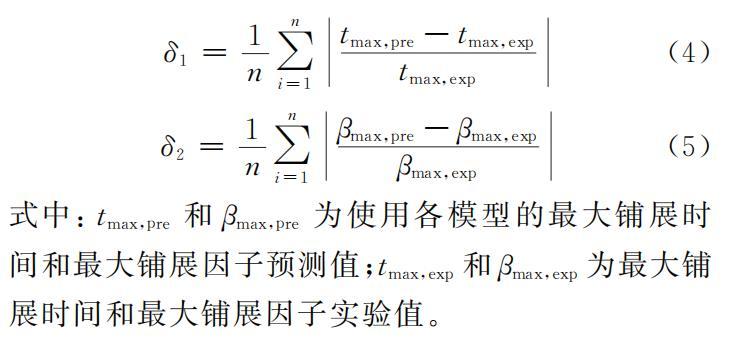 利用表1中的模型,對乙醇液滴沖擊過冷水平壁面的最大鋪展時間和最大鋪展因子進行預測,并采用相對平均偏差δ為評價指標,衡量不同公式的預測效果