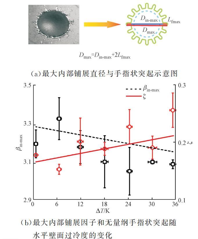 為了揭示βmax隨水平壁面過冷度的這一非單調變化,將βmax分為兩部分,并分別研究各部分與乙醇濃度的關系。如圖7(a)所示,βmax包含內部鋪展無量綱直徑βin-max=Din-max/D0,以及邊緣的無量綱指狀長度ζ=LfmaxD0,其中Din-max為液滴鋪展到最大程度的內部鋪展直徑,Lfmax為液滴鋪展至最大的指狀長度。當ζ<0.15時,認為液滴不形成指狀突起,當ζ≥0.15時,認為液滴形成指狀突起。