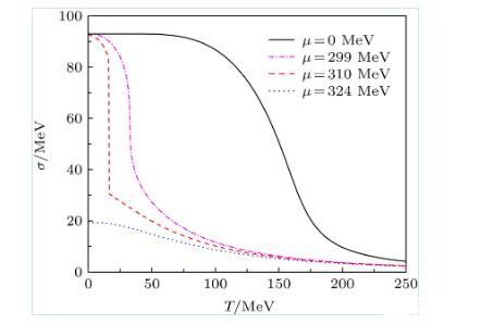 圖1在不同夸克化學(xué)勢密度條件下,σ場的真空期望值隨溫度的演化行為