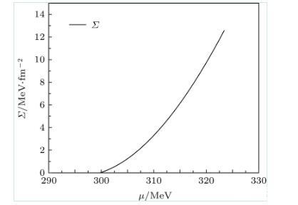 利用薄壁近似,圖2給出了當(dāng)T=Tc時,夸克強(qiáng)子一級相變的表面張力隨夸克化學(xué)勢的變化。可知在一級相變區(qū)域,當(dāng)化學(xué)勢增大時,強(qiáng)子相的表面張力也隨著化學(xué)勢增大。當(dāng)溫度接近零時,強(qiáng)子夸克相變的表面張力約為12.6 MeV/fm2.在T→0的情況,本文理論預(yù)言與文獻(xiàn)一致,但該文獻(xiàn)只是考慮T=0的冷夸克物質(zhì)的夸克強(qiáng)子一級相變。