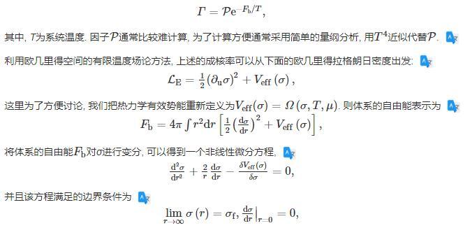 在偽真空的環(huán)境下,大小不一的真真空泡泡,由于量子漲落和熱漲落隨機(jī)出現(xiàn)并消失,直至泡泡的半徑大于等于臨界半徑,然后這些泡泡就會一直膨脹下去,完成一級相變的相變過程,并把多余的體系自由能以相變潛熱的形式釋放到環(huán)境中。基于這個機(jī)制,單位時間單位體積的臨界泡泡成核率可以表示為