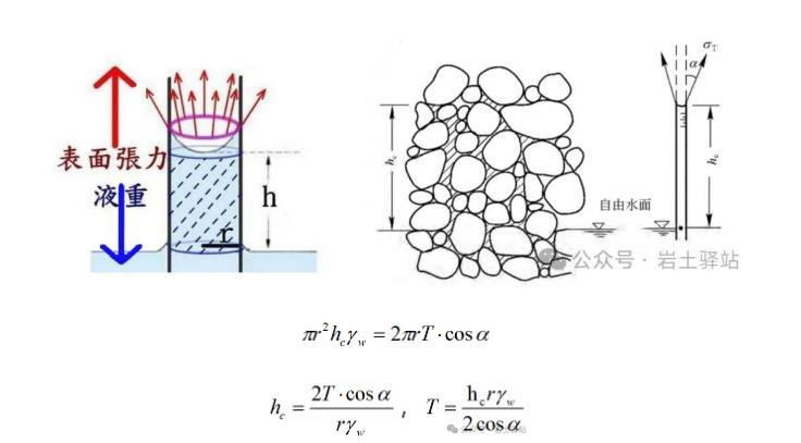 來自《土力學》式中,水膜張力T與溫度有關,單位:N/cm或KN/m;10°時,T=7.41×10-4N/cm=7.41×10-5KN/m;方向與毛細管成夾角α,該角度的大小與土顆粒礦物成分和水性質有關;