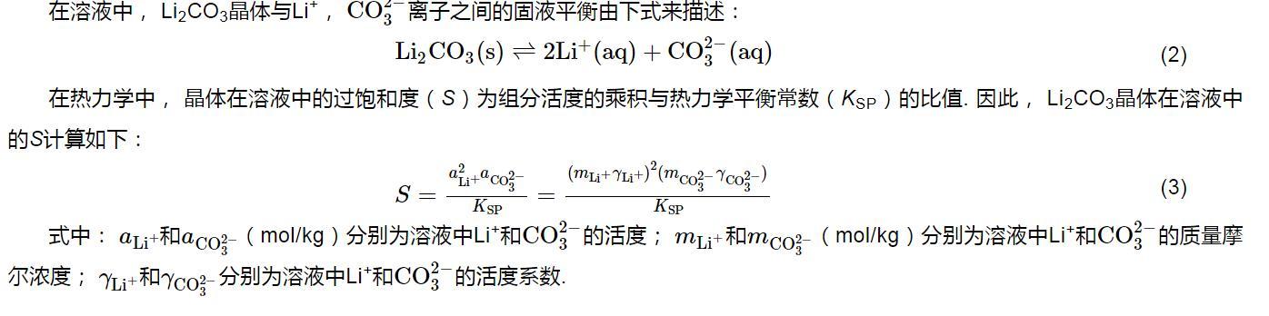 在熱力學(xué)中,晶體在溶液中的過飽和度(S)為組分活度的乘積與熱力學(xué)平衡常數(shù)(KSP)的比值.因此,Li2CO3晶體在溶液中的S計(jì)算如下:
