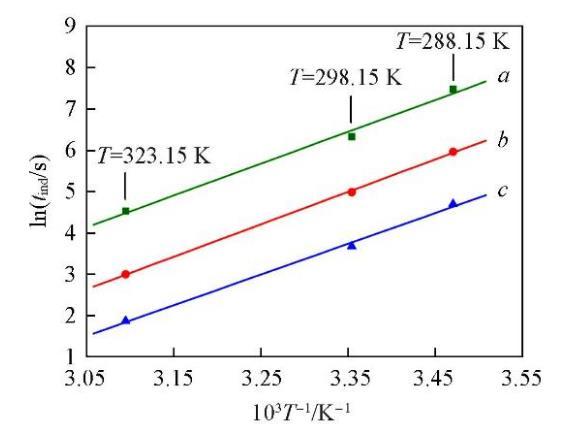 Liu和Nancollas[32]提出了一個反映成核誘導期(tind)與溫度關系的經(jīng)驗方程式: