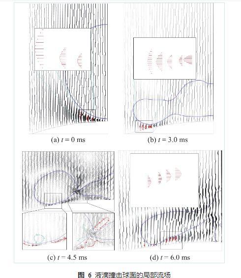 為了研究液滴撞擊高溫球面過程中液滴與氣膜的動力學及傳熱學特性,以液滴撞擊623.15 K球面為例展開模擬,液滴的撞擊速度為0.348 m/s,尺寸為d=1.61 mm,We=8.6.圖4展示了液滴撞擊過程中速度場、溫度場及壓力場的變化,圖5展示了液滴撞擊過程中流場的變化。