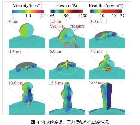從圖中可以看出,0 ms時,液滴開始接觸壁面,液滴主要在慣性力作用下沿球表面快速鋪展,受球面形狀的影響,重力對液滴的鋪展起到一定作用,液滴通過克服黏性損失和液滴變形將動能轉化為表面能;1.5 ms時,由于蒸汽積壓,液滴底部呈扁平狀,此時氣膜較薄,底部球面上存在熱流密度明顯較大的環狀區域,同時液滴運動方向由軸向開始轉變為徑向;3.0 ms時,隨著液滴繼續鋪展,流體向液滴前端積聚,徑向速度與壓力都開始減小,同時,液滴下方蒸汽流出后,周圍空氣沿球面流向液滴底部,形成回流;4.5 ms時,液滴達到最大鋪展,隨后,在表面張力的作用下開始收縮,外部環狀區域壓力與速度都較小,中心點處氣膜較薄,具有較高的熱流密度,同時,因為液滴形成了中間低四周高的結構,周圍氣流形成多個渦流;6.0 ms時,液滴逐漸收縮,外側速度與壓力明顯小于中心內部,且液滴運動方向由原來的周向變為軸向,中心區域與外側氣膜厚度都較薄,且中心區域更薄,因此熱流密度更大,多個渦流都在遠離液滴;7.5 ms時,液滴進一步收縮,外側速度與壓力都在升高,軸向方向速度減弱,由于液滴底部氣膜厚度不均勻,導致球面熱流密度分布呈多環形,不同區域差異較大,同時,因為液滴底部壓力較高,對底部氣膜擠壓作用較強,使氣流逸散速度進一步提高;9.0 ms-13.0 ms階段,液滴逐漸脫離壁面,壁面熱流密度隨之減小,直到液滴完全脫離壁面,周圍氣流在液滴的帶動下逐漸沿軸向遠離球面,壁面附近氣流速度逐漸減小。